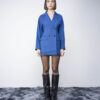 Blazer doppiopetto con manica a kimono in charmelaine di pura lana vergine con dettaglio bustino sul retro per regolazione della taglia. Il capo è caratterizzato da una linea dritta, sciancratura su fianchi, revers a lancia, taschino utilizzabile sul petto sinistro, tasche a filetto con pattine applicate ed occhielli in ottone bagno argento. Il modello si presenta foderato e chiuso frontalmente con abbottonatura doppiopetto. Il capo è stato realizzato sartorialmente ed è in taglia unica. Capo della linea Timeless. Made in Italy.